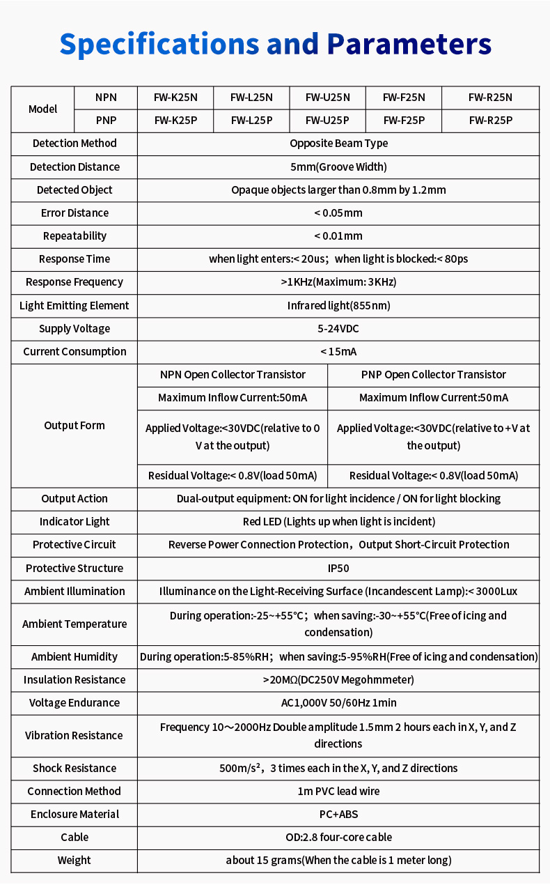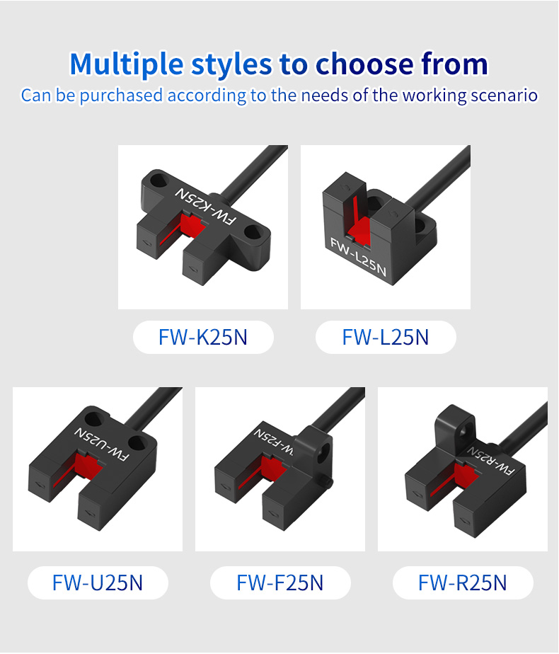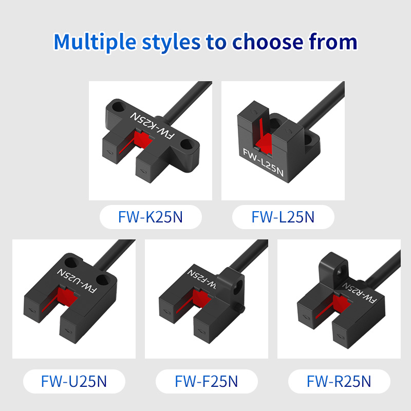 हम समझते हैं कि कोई भी दो एप्लिकेशन समान नहीं हैं। FW25 श्रृंखला कई शैलियों और कॉन्फ़िगरेशन में उपलब्ध है, जिससे आप अपने विशिष्ट कार्य परिदृश्य के लिए सही सेंसर खरीद सकते हैं। अपने मौजूदा पीएलसी, माइक्रोकंट्रोलर, या अन्य नियंत्रण प्रणालियों में निर्बाध रूप से एकीकृत करने के लिए विभिन्न आउटपुट प्रकारों (जैसे, एनपीएन, पीएनपी, एनओ, एनसी), केबल या कनेक्टर संस्करण और सेंसिंग रेंज में से चुनें।