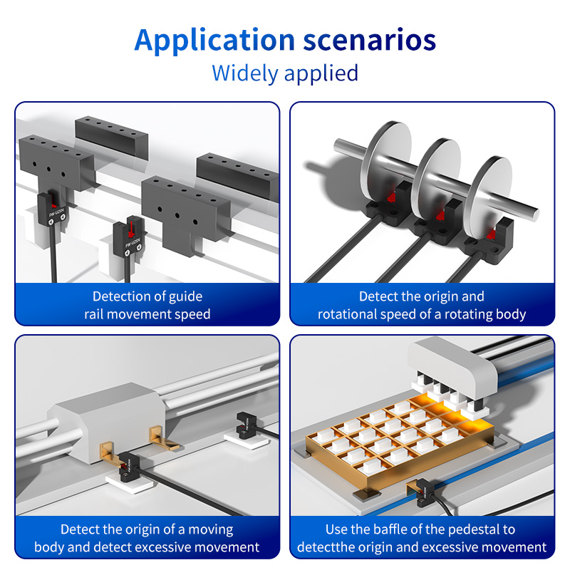 FW25 यू-ग्रूव सेंसर की बहुमुखी प्रतिभा इसे पैकेजिंग, सामग्री हैंडलिंग, सीएनसी मशीनिंग और असेंबली ऑटोमेशन सहित कई उद्योगों में एक लोकप्रिय घटक बनाती है। गाइड रेल मूवमेंट स्पीड का पता लगाना: रैखिक गति प्रणालियों में, चलती गाड़ी पर लगाया गया झंडा यू-ग्रूव से गुजर सकता है। समय के साथ दालों की गिनती करके, FW25 गाइड रेल की रैखिक गति की सटीक गणना कर सकता है, जिससे गति की निगरानी और नियंत्रण सक्षम हो सकता है। चलती हुई बॉडी की उत्पत्ति और ओवर-यात्रा का पता लगाएं: सेंसर होमिंग अनुक्रमों के लिए बिल्कुल उपयुक्त है। लीनियर एक्चुएटर या रोबोट आर्म पर एक टैब खांचे से होकर गुजरता है, जो नियंत्रक को एक सटीक "होम" या "ओरिजिन" सिग्नल प्रदान करता है। इसके अतिरिक्त, अधिक यात्रा का पता लगाने, यांत्रिक क्षति को रोकने और परिचालन सुरक्षा सुनिश्चित करने के लिए यात्रा के अंत में एक दूसरा सेंसर लगाया जा सकता है। घूमने वाले शरीर की उत्पत्ति और घूर्णन गति का पता लगाएं: घूर्णन शाफ्ट पर एक एकल टैब या बहु-दांतेदार पहिया माउंट करें। जैसे ही प्रत्येक टैब 5 मिमी खांचे से गुजरता है, FW25 एक पल्स उत्पन्न करता है। प्रति क्रांति एक एकल पल्स मूल डेटा प्रदान करता है, जबकि कई पल्स सटीक घूर्णी गति गणना (आरपीएम) की अनुमति देते हैं, जो मोटर नियंत्रण और प्रक्रिया निगरानी के लिए आवश्यक है। पोजिशनिंग के लिए माउंटिंग ब्रैकेट बैफल्स के साथ उपयोग करें: कई सिस्टम सरल, निश्चित बैफल्स का उपयोग करते हैं। इन बाफ़लों की उपस्थिति या स्थिति का पता लगाने के लिए FW25 को इसके माउंटिंग ब्रैकेट या कस्टम फिक्स्चर के साथ जोड़ा जा सकता है, जिससे एक सरल और लागत प्रभावी सीमा स्विचिंग सिस्टम तैयार होता है।