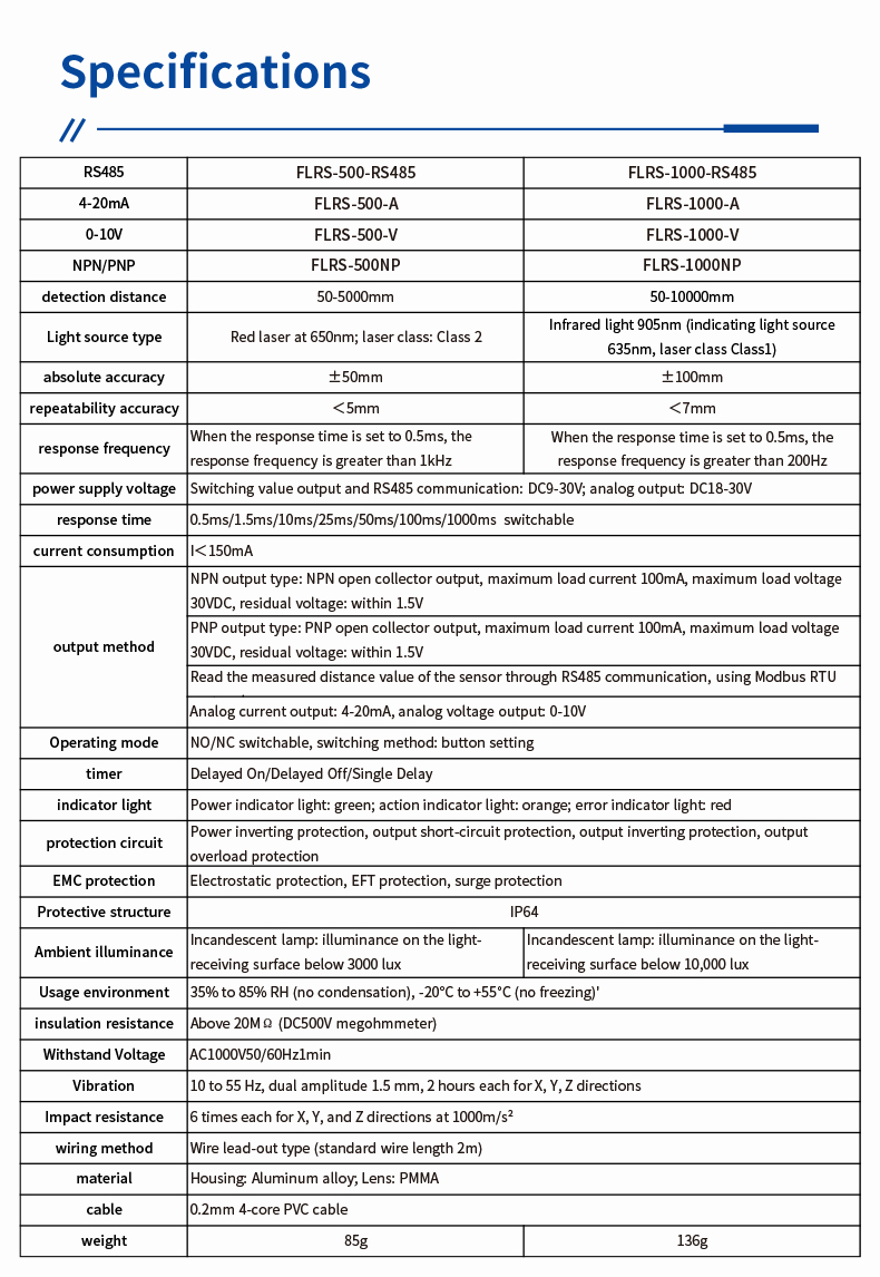 मल्टी-लेयर सुरक्षा के साथ निर्मित - इलेक्ट्रोस्टैटिक, ईएफटी और सर्ज प्रोटेक्शन सहित - एफएलआरएस श्रृंखला आपके उपकरण की सुरक्षा करती है और परिचालन सुरक्षा को बढ़ाती है। इसका कॉम्पैक्ट, एकीकृत माप और नियंत्रण डिज़ाइन स्थान की आवश्यकताओं को कम करता है और वायरिंग की जटिलता को कम करता है, जिससे दक्षता और स्थापना में आसानी दोनों होती है। अपनी विशिष्ट श्रेणी आवश्यकताओं से मेल खाने के लिए FLRS-1000-RS485 (50-10,000 मिमी) या FLRS-500-RS485 (50-5,000 मिमी) जैसे मॉडलों में से चुनें।