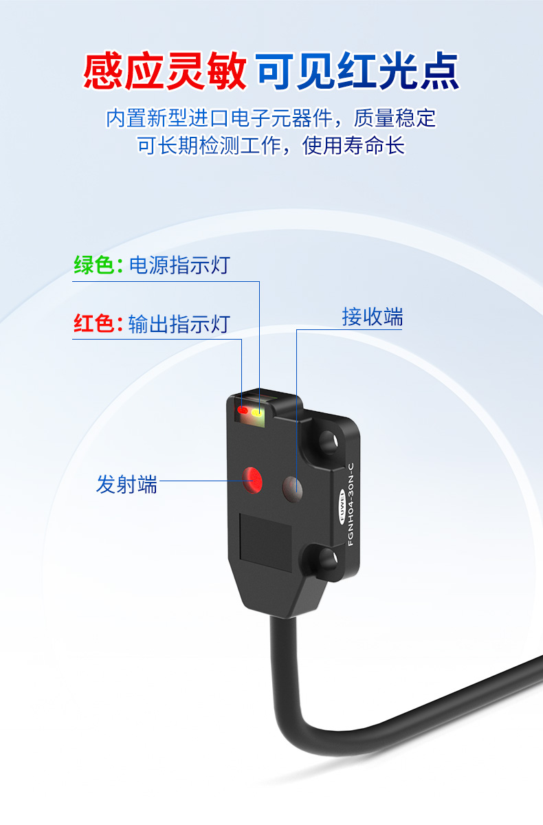 दूसरा, सेंसर नए आयातित इलेक्ट्रॉनिक घटकों को शामिल करता है, जो एक दृश्यमान लाल प्रकाश उत्सर्जन बिंदु के साथ अत्यधिक संवेदनशील पता लगाने की पेशकश करता है। यह पता लगाने की दृश्यता और सटीकता को काफी बढ़ाता है। स्थिर गुणवत्ता के साथ, दीर्घकालिक निरंतर संचालन और विस्तारित सेवा जीवन के लिए समर्थन, यह विशेष रूप से औद्योगिक वातावरण की मांग के लिए अनुकूल है। उच्च पुनरावृत्ति और विश्वसनीयता की आवश्यकता वाले अनुप्रयोगों के लिए - जैसे कि एलईडी पर पिन का पता लगाने वाले सेंसर - यह फीचर काफी हद तक झूठी पहचान दर और उपकरण रखरखाव आवृत्ति को कम करता है, जिससे समग्र उत्पादन दक्षता बढ़ जाती है।