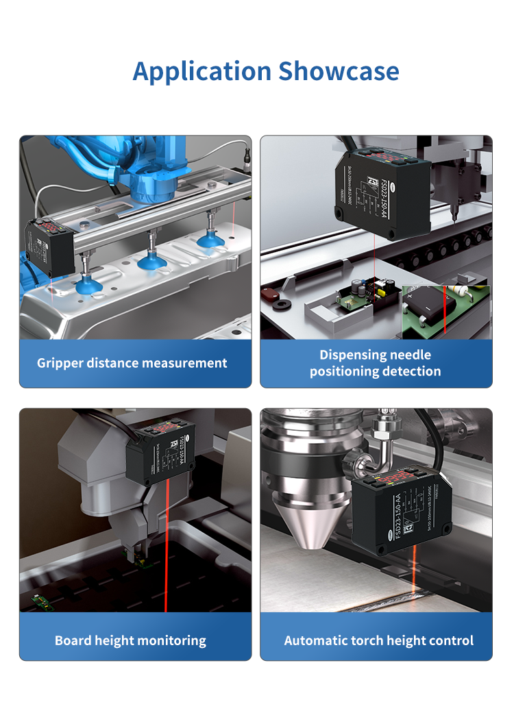 पारंपरिक सेंसर को अक्सर संकीर्ण रेंज (जैसे कि फिक्स्ड 30 मिमी डिटेक्शन रेंज) के कारण उपकरणों के कई मॉडलों को अनुकूलित करने के लिए मजबूर किया जाता है, जिसके परिणामस्वरूप उत्पादन लाइन परिनियोजन लागत में वृद्धि होती है। FSD23 श्रृंखला लेजर विस्थापन सेंसर, हालांकि, स्व-विकसित ऑप्टिकल मॉड्यूल डायनेमिक फोकसिंग तकनीक के माध्यम से 10 मिमी से 250 मिमी की निरंतर समायोज्य पहचान सीमा का एहसास करते हैं, जो कि माइक्रोन चिप सोल्डरिंग जोड़ों से लेकर ऑटोमोटिव शीट मेटल गैप्स तक सभी परिदृश्यों के लिए उपयुक्त है।