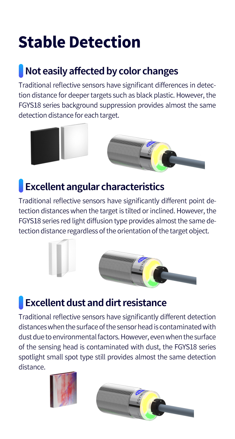 पारंपरिक सेंसर अक्सर रंग या भौतिक विविधताओं के कारण वस्तुओं का पता लगाने में विफल होते हैं। FGY18-10NU-B रंग या सामग्री की परवाह किए बिना वस्तुओं का स्थिर पता लगाने के लिए उन्नत ऑप्टिकल डिज़ाइन को नियोजित करता है। चाहे सीएनसी मशीनिंग के दौरान धातु भागों, प्लास्टिक वर्कपीस, या गहरे रंग की सामग्री का पता लगाना, यह लगातार संवेदनशीलता को बनाए रखता है, जिससे सहज और सटीक उत्पादन प्रक्रियाएं सुनिश्चित होती हैं।