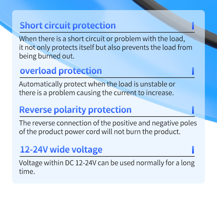रिवर्स पोलरिटी प्रोटेक्शन: गलत बिजली की आपूर्ति के बिना ध्रुवीयता कनेक्शन को नुकसान पहुंचाता है, वायरिंग त्रुटियों के कारण होने वाली विफलताओं और नुकसान को रोकता है।