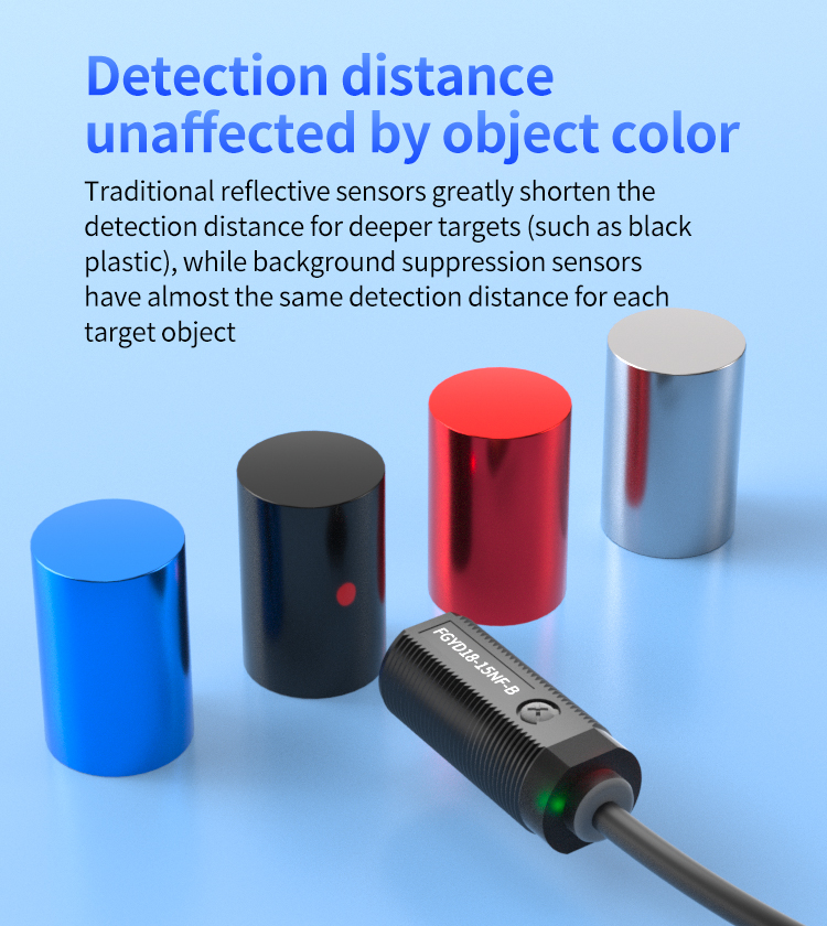 पारंपरिक चिंतनशील सेंसर लक्ष्य रंग और सामग्री से प्रभावित दूरी भिन्नताओं का पता लगाने के लिए अतिसंवेदनशील होते हैं, विशेष रूप से अंधेरे वस्तुओं का पता लगाने पर खड़ी दूरी क्षय का अनुभव करते हैं। FGYD18 श्रृंखला पृष्ठभूमि दमन प्रौद्योगिकी को नियोजित करती है। विशेष आंतरिक ऑप्टिकल घटकों और त्रिकोणीय सिद्धांतों का उपयोग करते हुए, यह केवल प्रकाश तीव्रता को प्राप्त नहीं करता है। इसके बजाय, यह किसी वस्तु की उपस्थिति को निर्धारित करने के लिए प्रकाश स्थान की स्थिति की गणना करता है। यह इसे प्रभावी ढंग से पृष्ठभूमि के हस्तक्षेप को अनदेखा करने में सक्षम बनाता है और एक पूर्व निर्धारित दूरी पर पता लगाने पर ध्यान केंद्रित करने को ठीक से लॉक करता है। नतीजतन, यह काले, सफेद, या अन्य रंगीन वस्तुओं के लिए लगभग लगातार पता लगाने की दूरी को प्राप्त करता है, जिससे पता लगाने की विश्वसनीयता और स्थिरता में काफी वृद्धि होती है।
